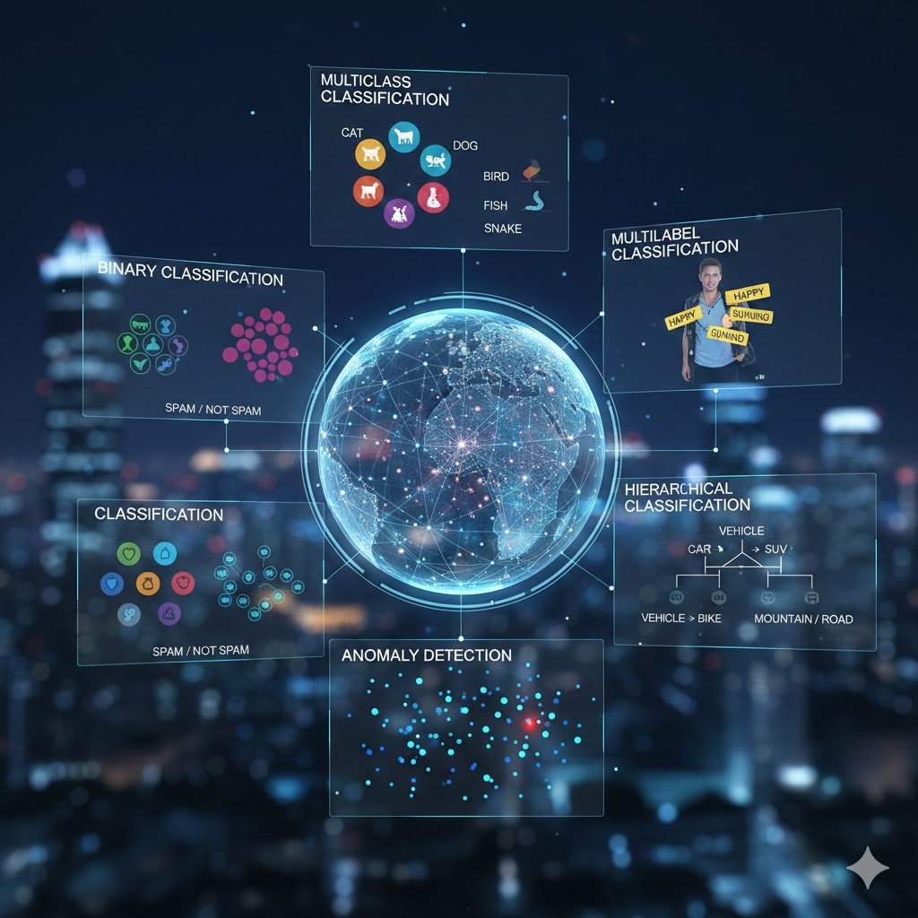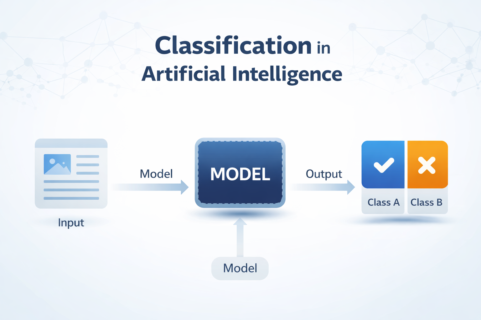 Classification mak tarefa ida iha AI/ML ne’ebé uza atu halo klasifikasaun dadus ba kategoria (klase) ne’ebé mak define ona. Sistema aprende padraun husi dadus ne’ebé iha label (labeled data), no depois bele hatudu label ba dadus foun. Ezemplu: identifika email hanesan spam ka lae spam, ka identifika imajen hanesan bibi, asu, no seluk. Classification importante tebes ba analiza predisaun, filtru spam, no rekognisaun imajen. Ne’e mak parte importante husi supervised learning, ne’ebé model liga karakterístika input ba klase espesífiku atu ajuda halo desizaun automatiku no kompriende dadus ne’ebé la organiza..